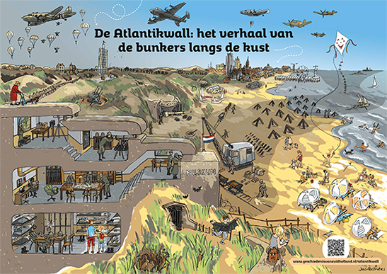 onderwijs en verstrekt aan scholen in Zuid-Holland in de regio van de Atlantikwall. Op de voorzijde laat de illustratie zien hoe de bunkers en de duinen in het verleden werden en in het heden worden gebruikt. Op de achterzijde aanvullende informatie en lestips voor leerkrachten.