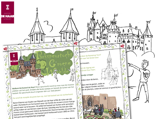 Illustraties en vormgeving boekje met kinderspeurtocht voor in het park van kasteel de Haar. Sommige tekeningen in het boekje kunnen worden ingekleurd.
