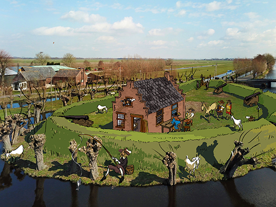Illustratie ingetekend in 360 graden foto van de Koeneschans. Met deze VR-beleving kun je een situatie weergeven die niet "meer" bestaat. Omdat onbekend is hoe de situatie precies was, is voor een suggestieve weergave gekozen. Op de Koeneschans is een innovatieve VR-paal neergezet, je kunt daar met je eigen telefoon in de VR-bril de Koeneschans als onderdeel van de Oude Hollandse Waterlinie beleven