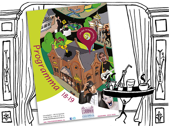 Coverillustratie voor programmabrochure 2018/2019, illustratie voor kleurplaat en strooi-illustratie voor diverse toepassingen.