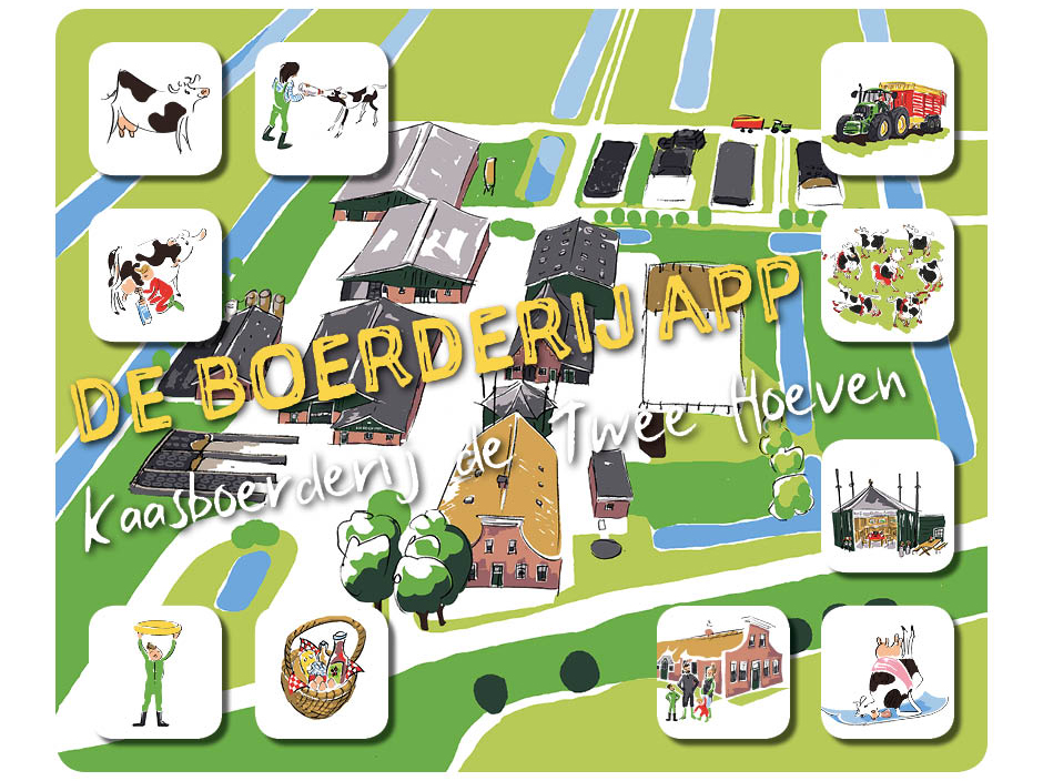 Illustraties voor de boerderij app ontwikkeld door Meester Dennis. Op kaasboerderij de Twee Hoeven kunnen kinderen met hun ouders een interactieve rondleiding volgen door middel van deze app. De illustraties zijn ook te vinden op de producten en informatieborden op het erf.