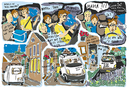 Stripverhaal over onze vakantiestress voor op een ansichtkaart. Deze kaart hebben we in 2016 vanaf ons vakantieadres verstuurd aan vrienden en relaties.